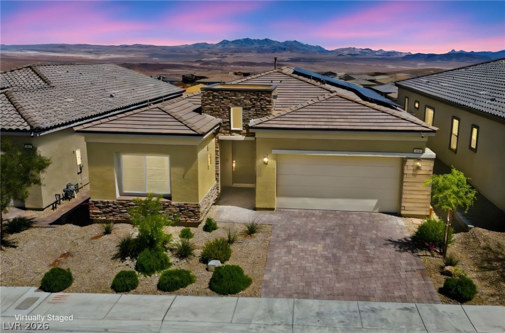 Enjoy single-story living in a gated community with unobstructed mountain views, plus a thoughtfully upgraded set of comfort and efficiency features throughout. Designed with energy savings in mind, the home includes a solar power lease to help reduce monthly electric costs, along w/a tankless water heater for on-demand hot water efficiency, a dedicated EV charging outlet, and a whole-home water softener/filtration system for added comfort and performance. The chef's kitchen is designed to impress with a huge island, quartz countertops, custom cabinets, and convenient pull-out shelving, while custom dining room lighting elevates entertaining. Soaring 10' ceilings and an electric fireplace make the family room a welcoming place to unwind, and smart-home peace of mind comes with a Eufy video doorbell. Outdoors, you'll love the landscaped, low-maintenance backyard w/a covered patio for year-round relaxing. The primary suite is finished w/a custom closet for polished, organized storage.